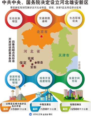 中共中央、國務院印發的通知稱,河北雄安新區規劃范圍涉及河北省雄縣、容城、安新三縣及周邊部分區域,地處北京、天津、保定腹地,區位優勢明顯、交通便捷通暢、生態環境優良、資源環境承載能力較強,現有開發程度較低,發展空間充裕,具備高起點高標準開發建設的基本條件。
