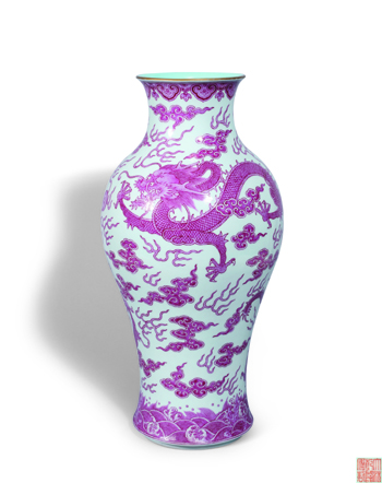 “清乾隆·胭脂紅料蒼龍教子圖撇口瓶”最終成交價為389.4萬港幣。胭脂紅是清代極具劃時代意義和技術含量的彩釉之一,此器通體以胭脂紅料裝飾,繪飾細膩,勾畫精湛,整器瑰麗繁復,體現了皇家制器的雍容奢華。