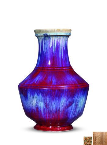 來源于久原躬弦舊藏的“清雍正·窯變釉盤口弦紋瓶”最終以383.5萬港幣成交。窯變釉是雍正時唐英督理景德鎮御窯廠時仿鈞窯釉色所繁衍出的一個創新品種,此件作品即為以窯變之釉色燒制當朝創新之器型,紅紫交融,合于天造,厭于人意。