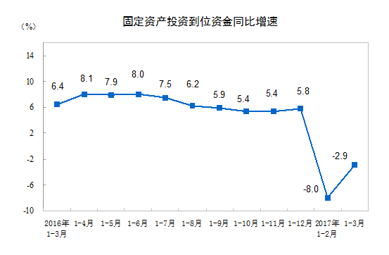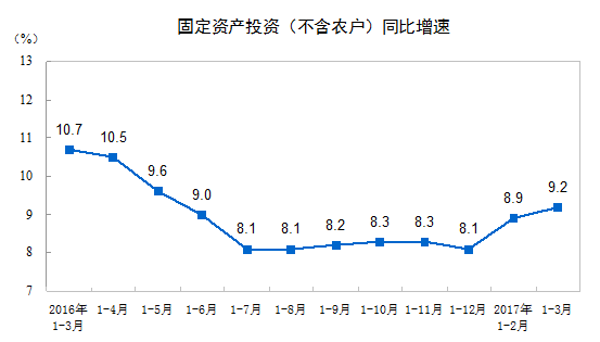 2017年1-3月份,全國固定資產投資(不含農戶)93777億元,同比名義增長9.2%,增速比1-2月份提高0.3個百分點。從環比速度看,3月份固定資產投資(不含農戶)增長0.87%。