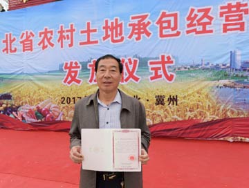 圖為衡水市冀州區莊子頭村村民魏九明在展示領到的《農村土地承包經營權證》。新華社記者 王曉/攝?