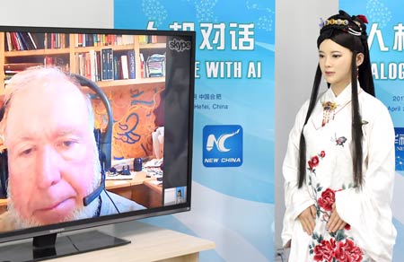 圖為當日機器人佳佳通過網絡與科技觀察家凱文·凱利對話。新華社記者 郭晨/攝