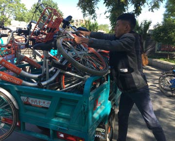 沒過多久,一輛載滿共享單車、用于調度的電動三輪車駛來。車剛停穩,就被伸長手臂競相掃描二維碼開鎖的人們團團圍住。胡貴林緊忙上前一塊卸車。此后約40分鐘時間里,幾輛調度車周而復始跑了十多趟,每次都是滿載而來、空車離去。