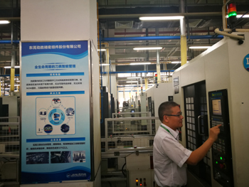 “每條線都有一個變速機看板,看板上會顯示這條生產線最新的狀態,包括CNC的開工情況。就像這條生產線的22臺機器狀態中,有19臺處在加工狀態,3臺處在離線狀態。這條生產線結果達成率為88.5%,那這個白班的加工率為85.06%,夜班的加工率43.46%,已完成加工產品482件,這些都能直觀地顯示出來?!眲艅傧嚓P工作人員介紹,“員工也可以拿著iPad,掃描CNC機上的二維碼,iPad上就顯示這是哪臺機床,正在加工的是哪種產品,用的是哪些輔助材料,哪一把刀?!?/p>