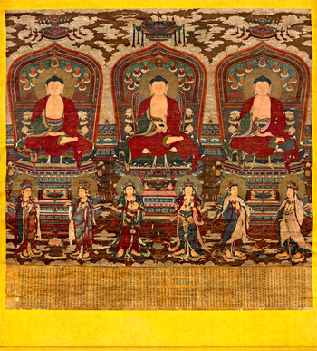 永樂御制《三世佛六菩薩寶相》,裝飾繁縟,衣紋飄逸流暢,色彩富麗沉穩,帶有唐宋以來中原地區佛教繪畫的鮮明遺風,同時又吸收和融入了元代佛像造型及流行于內地的藏傳佛教藝術元素,但整體風格又不同于元代佛畫,具有明初佛畫的鮮明特點,展現出端莊典雅、富麗堂皇、恢宏大氣的皇家藝術氣象,比定為國家館藏一級品最負盛名的敕賜山西右玉寶寧寺佛畫還要早五十多年,風格一脈相承,且繪畫技法有過之而無不及,是罕見的宮廷佛教文物瑰寶。