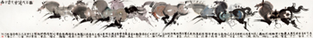 《八駿行云追風圖》中,韓美林取意隋唐詩人李賀的幾首馬詩。八首馬詩對應八匹奔騰的駿馬,每一匹良駒配一首詠嘆和歌頌。原作畫面氣勢恢弘,似有身臨其境,感受萬馬奔騰的嘶叫和震耳欲聾的馬蹄聲從身邊呼嘯而過的既視感。畫面的帶入感很強,像是一種情感的壓迫,又像是一場挑戰你所有感官的視覺盛宴。唐人李賀的《馬詩》是通過詠馬、贊馬或慨嘆馬的命運,來表現志士的奇才異質、遠大抱負及不遇于時的感慨與憤懣。而韓美林通過對馬詩的引用,更多的是借用詠馬的意境和情懷,讓人們去感受對《馬》生命不息的感慨和對《馬》自在狂野、自由奔放狀態的美好期盼和愿望。