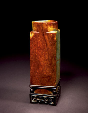 另外,還有一件玉琮也值得關注。根據用料及工藝判斷,這件玉琮應為距今四千多年前的齊家文化風格。周身不琢紋飾,一側留有漿皮。經過歷代收藏家盤玩,皮殼早已“熟透”,留皮處呈誘人的棗紅皮色。眾所周知,清宮有改制前朝舊物的習俗,這件玉琮應該是在清代之前即已出土,后來入藏清宮,在玉琮內部配制銅膽,并專門配有紅木底座,被改成花插使用。這種老器新用的做法,在今天故宮博物院館藏器物中經常能見到。