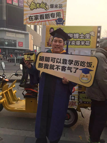 ??? “瘋老板”創始人酆尚寬在北京街頭推廣自己的品牌。(資料照片) |