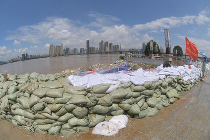 7月3日零時12分,湘江長沙站水位上升到39.51米,創下有記錄以來歷史新高。這是長沙城區湘江沿岸用沙袋修筑的子堤(7月3日攝)。記者 龍弘濤 攝? |