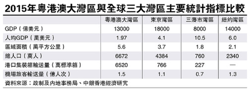 二是經濟活動規??膳c世界一流灣區并駕齊驅。2015年粵港澳大灣區GDP達到1.3萬億美元,是東京灣區的四分之三,接近紐約灣區的水準,為三藩市灣區的1.6倍,在全球一流灣區中處于中游位置。2016年大灣區進出口貿易高達1.89億美元,在全球灣區中處于獨一無二地位,比最早依靠出口加工起家的東京灣區有過之而無不及。作為重要的交通樞紐,粵港澳大灣區擁有世界級的??崭廴?,2015年港口集裝箱輸送量超過6500萬標準箱,分別是東京灣區和三藩市灣區的8.5倍和37.5倍;機場旅客輸送量高達1.5億人次,也超過世界三大灣區。