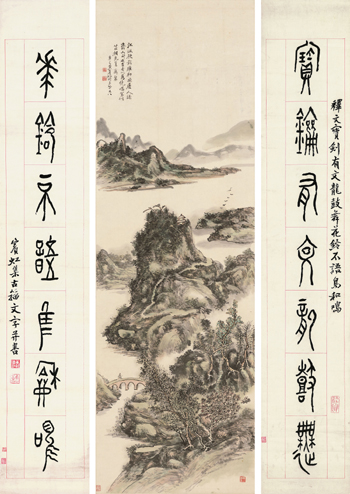 黃賓虹 《秋山策杖圖·篆書七言聯》 |