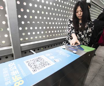 6月14日,乘客在武漢BRT武昌火車站刷支付寶進站乘車。螞蟻金服數據顯示,武漢城區98%的出租車、超過80%的超市便利店、超過75%的餐飲門店、休閑娛樂等行業均支持移動支付。去年武漢市共有超過100萬人次,使用支付寶在醫院掛號、就診。?記者 肖藝九/攝 |