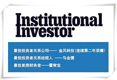 國際資本市場權威金融雜志《機構投資者》(Institutional Investor)年度評獎結果日益揭曉,金風科技從2,500余家亞洲上市公司中脫穎而出,包攬“最佳投資者關系公司”、“最佳投資者關系經理人”和“最佳首席財務官”三項大獎。