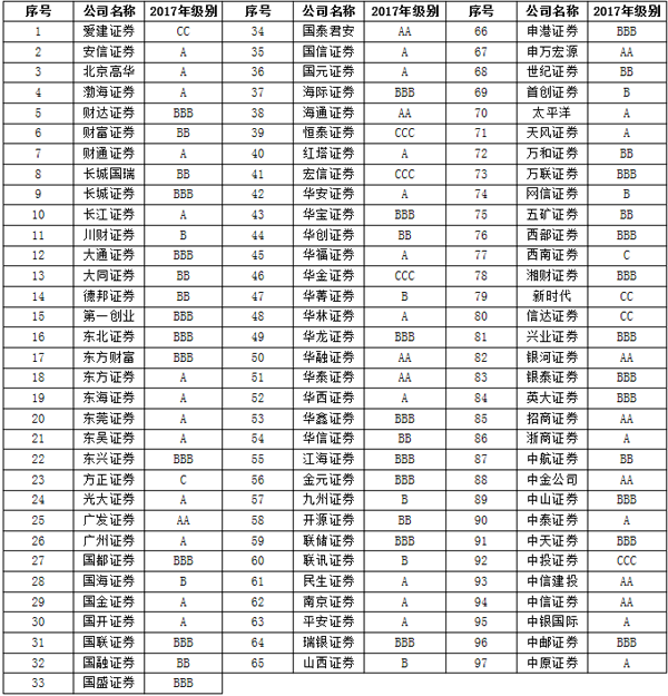2017年各證券公司分類結果如下(按公司名稱拼音順序排序):
