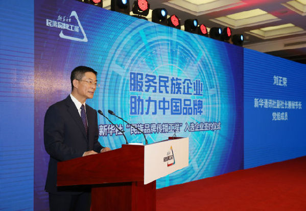 ↑2017年8月26日,在“民族品牌傳播工程”入選企業簽約儀式上,新華社副社長兼秘書長劉正榮發表講話。新華社記者 肖磊濤 攝