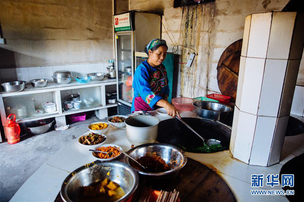 湖南湘西州花垣縣雙龍鎮十八洞村村民龍興花在自家的農家樂為客人準備飯菜(9月7日攝)。 新華社記者 朱煒 攝