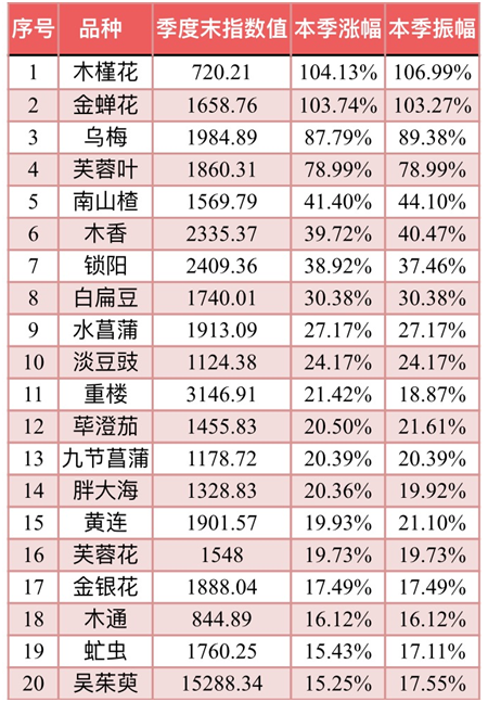 在監測的中藥材品種中,動物類、花草類、野生類品種指數表現比較活躍。今年三季度,木槿花、金蟬花的指數漲幅均超過了100%,烏梅、芙蓉葉及南山楂的漲幅也超過了40%。報告指出,天氣異常導致采收困難、產量降低,庫存薄弱等,是推動這些指數上漲的重要因素。