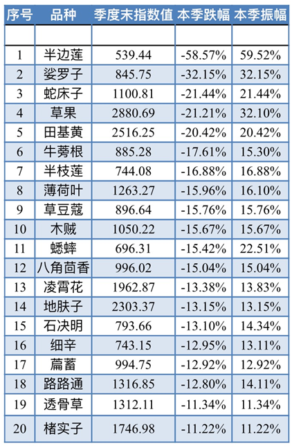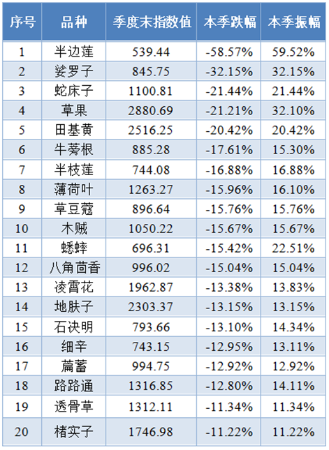 與上述藥材品種指數大幅上漲形成鮮明對比的是,半邊蓮指數大幅下跌58.57%,娑羅子指數下跌32.15%,蛇床子、草果和田基黃的下跌幅度超過20%。對此,報告分析認為,與這些中藥材價格波動與種植環節存在不小關系。以娑羅子為例,該藥材于2015年達到歷史高價200元,這刺激了產地生產積極性,但也導致市場上供大于求,價格走入下跌通道,同時庫存須經過長時間消化,短期內娑羅子的價格仍將在低谷徘徊。