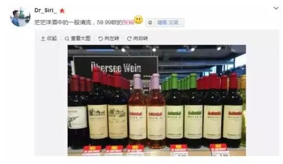 不久前,有位朋友在微博 po 圖稱在德國漢諾威的超市中偶遇張裕葡萄酒,還配文:“茫茫洋酒中的一股清流”。