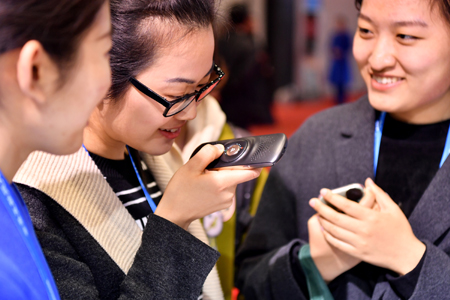 12月2日,在世界互聯網大會·互聯網之光博覽會上,參觀者在科大訊飛展臺體驗訊飛“曉譯”翻譯機。記者 李鑫 攝
