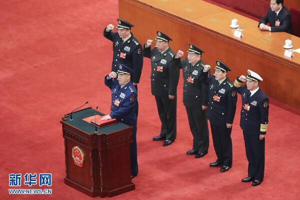 3月18日,十三屆全國人大一次會議在北京人民大會堂舉行第六次全體會議。大會經投票表決,決定許其亮、張又俠為中央軍委副主席,決定魏鳳和、李作成、苗華、張升民為中央軍委委員。這是中央軍委副主席、委員進行憲法宣誓。新華社記者 龐興雷 攝