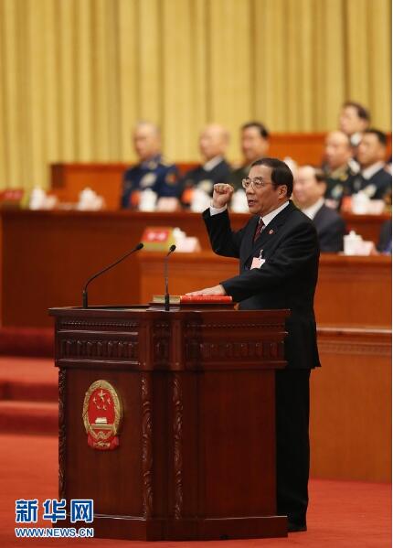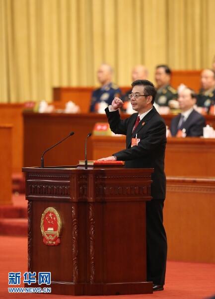 3月18日,十三屆全國人大一次會議在北京人民大會堂舉行第六次全體會議。周強當選為最高人民法院院長。這是周強進行憲法宣誓。新華社記者 姚大偉 攝