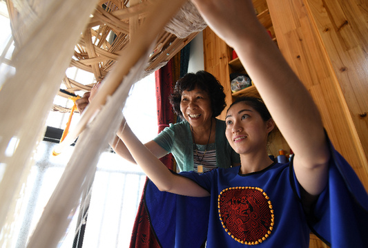 右圖為譚湘光(左)在工作室指導學生使用傳統織錦機。