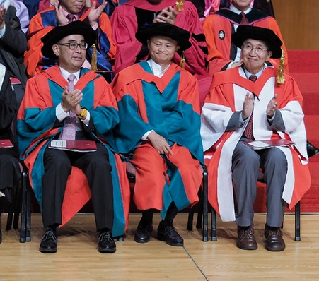 日前,香港大學授予企業家馬云(右二)、蒙德揚(右三)和科學家鄧青云(右一)共3人名譽博士學位,以表彰他們在學術和社會等方面作出的貢獻。新華社發(王申 攝)