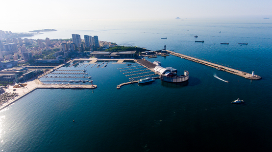 圖為無人機航拍的上合組織青島峰會主會場。記者 郭緒雷 攝