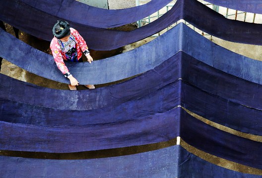 上圖:在廣西融水苗族自治縣紅水鄉黃奈苗寨,苗族婦女在晾曬染過的棉布。右下圖:苗族婦女在一塊織好的花飾上剪線頭。
