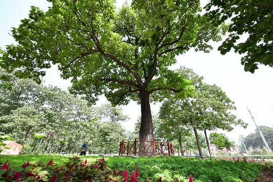 在河南蘭考縣焦裕祿干部學院門口,游客從“焦桐”下走過。記者 馮大鵬 攝