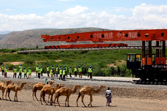 圖為2014年4月27日中國鐵建中土集團的工人在埃塞俄比亞德雷達瓦進行亞吉鐵路先期鋪軌作業的資料照片。新華社發(劉渝 攝)