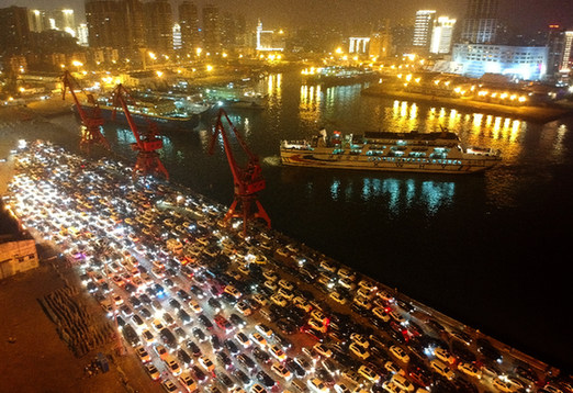 2月21日,在??谑行阌⒏?,大量滯留車輛等待過海前往廣東。記者 趙穎全 攝