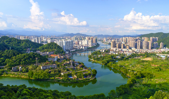 瀏陽河畔、羅霄山中崛起的瀏陽主城區。(鄧霞霖 攝)