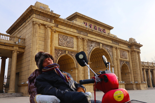 1月18日,在北京太陽城國際養老公寓大門前的廣場上,一位老人坐在代步車上曬太陽。記者 張小潔 攝