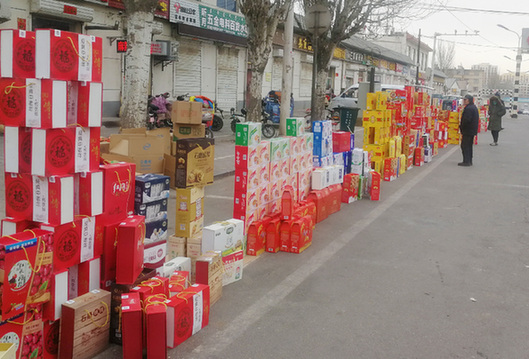 2月7日,內蒙古巴彥淖爾市臨河區雙河鎮先鋒橋北,披著華麗外衣的山寨牛奶,混在各種高檔禮盒中。記者 王靖 攝