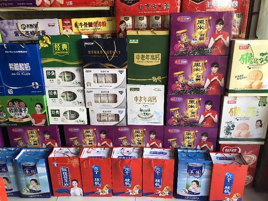 在河北省保定市曲陽縣人民醫院門口的北岳路上,琳瑯滿目的禮盒被商家搬到街道上堆成一座座“小山”。記者仔細對比發現,這些包裝精美的禮盒摻雜了很多山寨貨,“特侖蘇”變成了“特倫”,“六個核桃”變成了“六仁核桃”“六個甄核桃”,“露露杏仁露”變成了“承德杏仁露”等。這些山寨產品除了品牌名稱相似外,在包裝細節、廣告詞、形象代言人等方面都以假亂真。承德杏仁露的女代言人長得跟露露杏仁露的女代言人幾乎一模一樣,衣服一樣,發型一樣,連端杯子的姿勢和方向都一模一樣。而且商家特意將山寨貨與正品混在一起,一般消費者很難辨別,購買時極易混淆。
