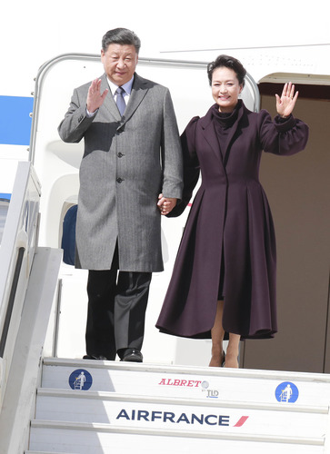 3月25日,國家主席習近平在巴黎愛麗舍宮同法國總統馬克龍會談。當日上午,習近平結束在尼斯的行程,乘專機離開尼斯赴巴黎,繼續對法國進行國事訪問。這是習近平和夫人彭麗媛抵達巴黎戴高樂機場。 新華社記者 丁林 攝