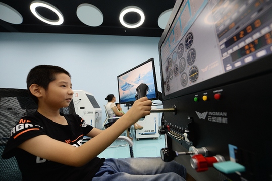 小游客在西安“九號宇宙”航天科普研學基地體驗飛行器模擬駕駛。記者 李一博 攝