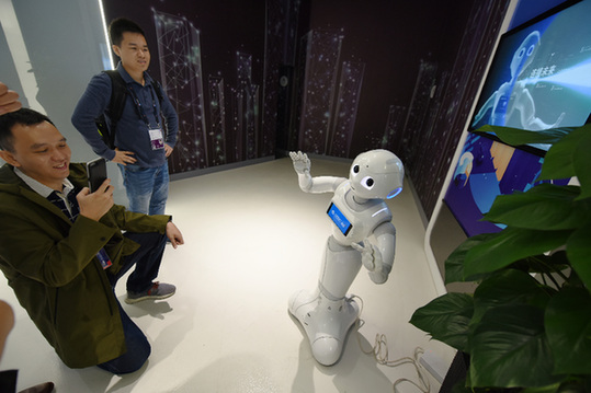 5月26日,參觀者在2019中國國際大數據產業博覽會上與5G+智能機器人進行拍照互動。記者 楊文斌 攝