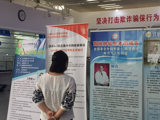 北京大學首鋼醫院門診部大廳內的“4+7”政策宣傳展板/ 鄧睿攝