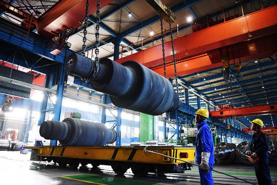 在中國一重集團的生產車間,起重機吊起產品。記者 王建威 攝