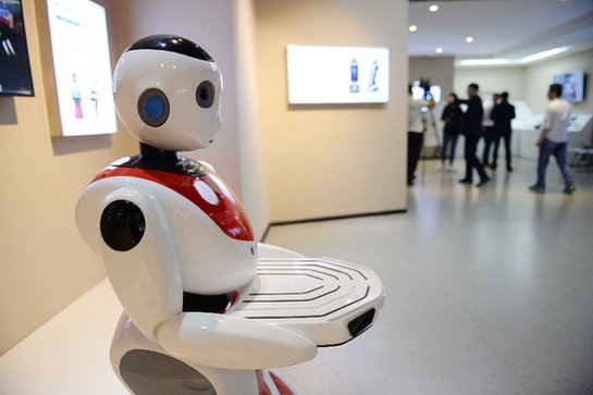 哈工大機器人集團展廳里展示的機器人。記者 王凱 攝