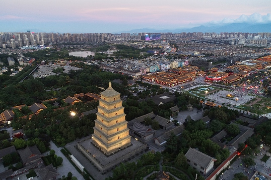 ??? 圖為盛夏時節日暮時分的西安大雁塔與大唐不夜城景區,吸引眾多游人前來一覽勝景。記者 邵瑞 攝