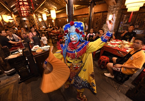 話音剛落,只聽火鍋店的天井里響起了悠揚的二胡聲,聞聲望去,一位古裝女琴師正在一方露天舞臺中間傾情表演。食客們紛紛起身,很快圍攏過去。接下來的半個小時內,舞蹈、說唱、舞龍、變臉、工夫茶等戲碼紛紛登場,四川特色十足,演員與食客熱情互動,引得眾人頻頻鼓掌叫好。