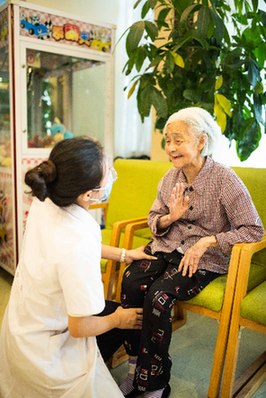 在成都一家養老公寓,醫護人員在與老人聊天。張可凡 攝