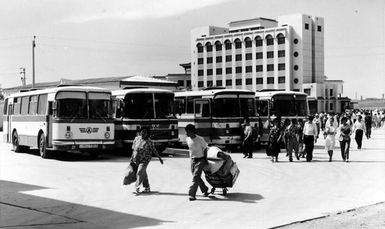 在滿洲里中俄互市貿易區,人們從俄羅斯巴士前走過。(2002年資料照片)