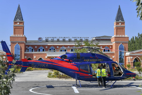 在新疆霍爾果斯旅游集散中心,工作人員為乘坐直升機游玩的旅客做起飛準備。記者 胡虎虎 攝