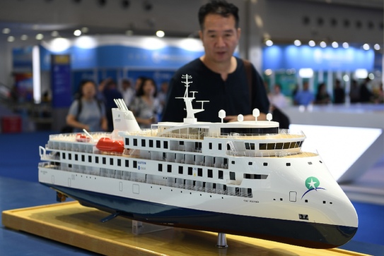 近日,2019中國海洋經濟博覽會在深圳開幕,觀眾在招商局展臺了解首艘國產極地探險郵輪“格雷格·莫蒂默”號。(記者 毛思倩 攝)