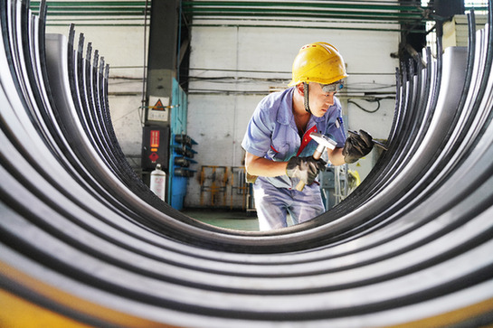 在哈電集團哈爾濱汽輪機廠生產車間,工人在進行生產作業。記者 王建威 攝